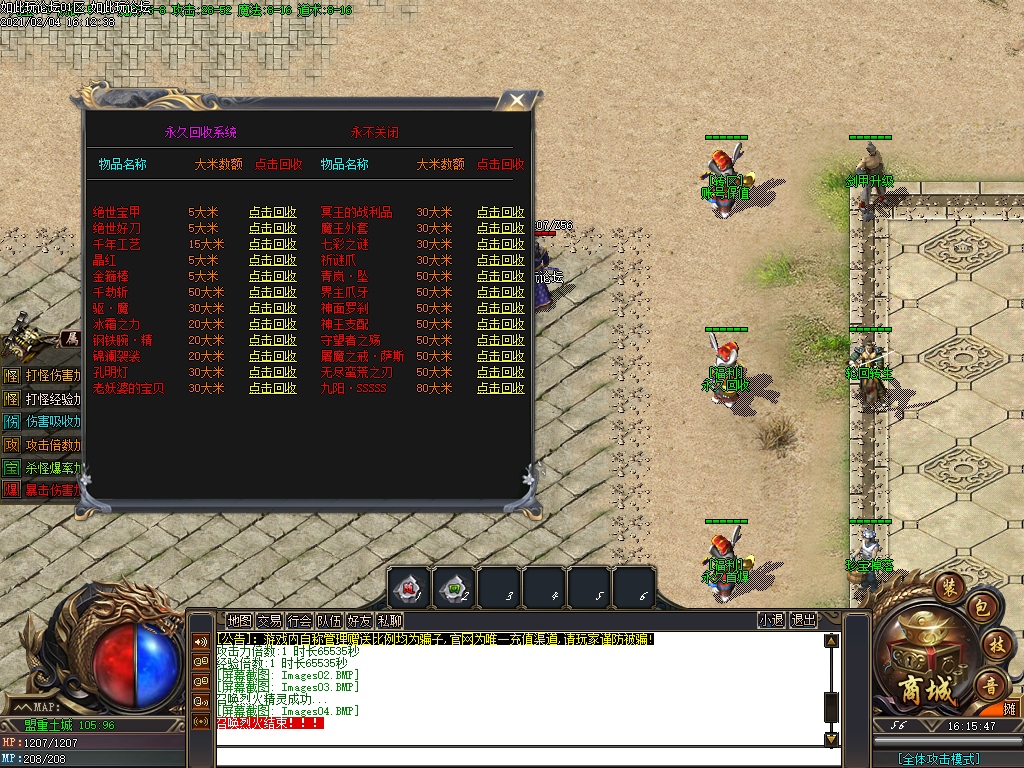 神阶天下神兵提示:请将有用的提前存入仓库,误回收后果自负.说明:回收只可获得80%金币量,另外20%金币自动填充为沙城奖励.回收神阶天下神兵回收:3000金币仙阶退魔斩提示:请将有用的提前存入仓库,误回收后果自负.说明:回收只可获得80%金币量,另外20%金币自动填充为沙城奖励.回收仙阶退魔斩回收:1200金币